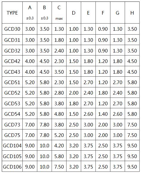 四、貼片電感GCD封裝尺寸列表: